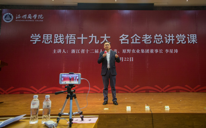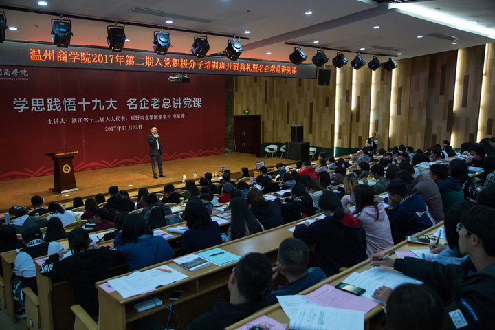 為了深入學習貫徹十九大精神,真正地讓黨的知識、精神在師生中尤其是大學生中入心、入腦,溫州商學院特別策劃了《名企老總講黨課》活動,通過知名企業(yè)家以自己、企業(yè)和社會的多重視角,講述其與黨如何結識、企業(yè)發(fā)展與國家進步、企業(yè)內部黨建以及企業(yè)家心目中的優(yōu)秀員工等內容,并就現(xiàn)場大學生關心的話題進行交流。