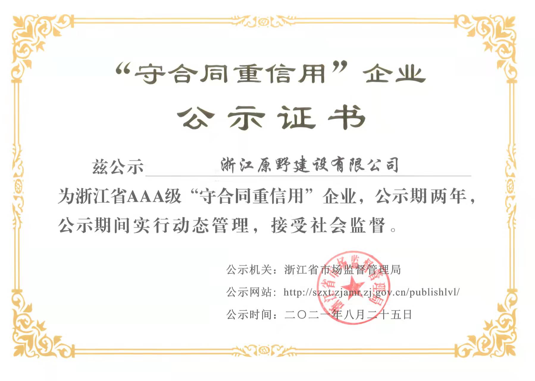 - 2021年8月,獲評浙江省AAA級"守合同重信用"企業(yè)