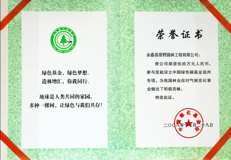 2008年捐贈50萬元參與發(fā)起設計中國綠色碳基金溫州專項,為我國林業(yè)應對氣候變化失業(yè)做出了積極貢獻。
