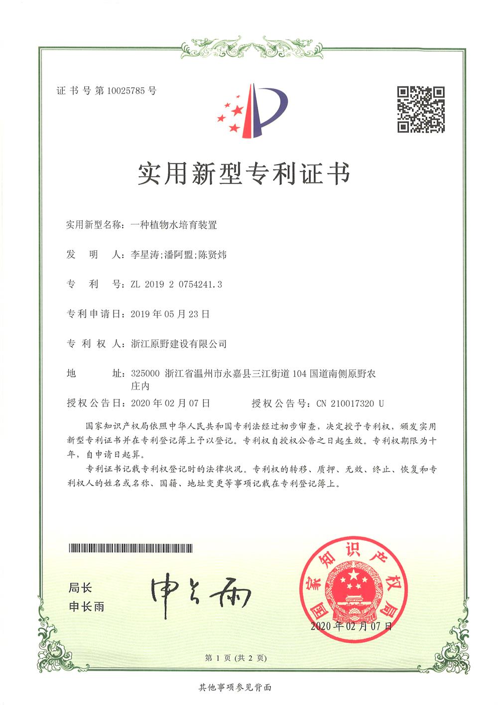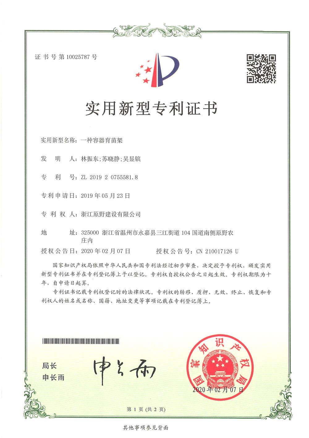 原野集團(tuán)喜獲5項(xiàng)實(shí)用新型專利證書(shū)
